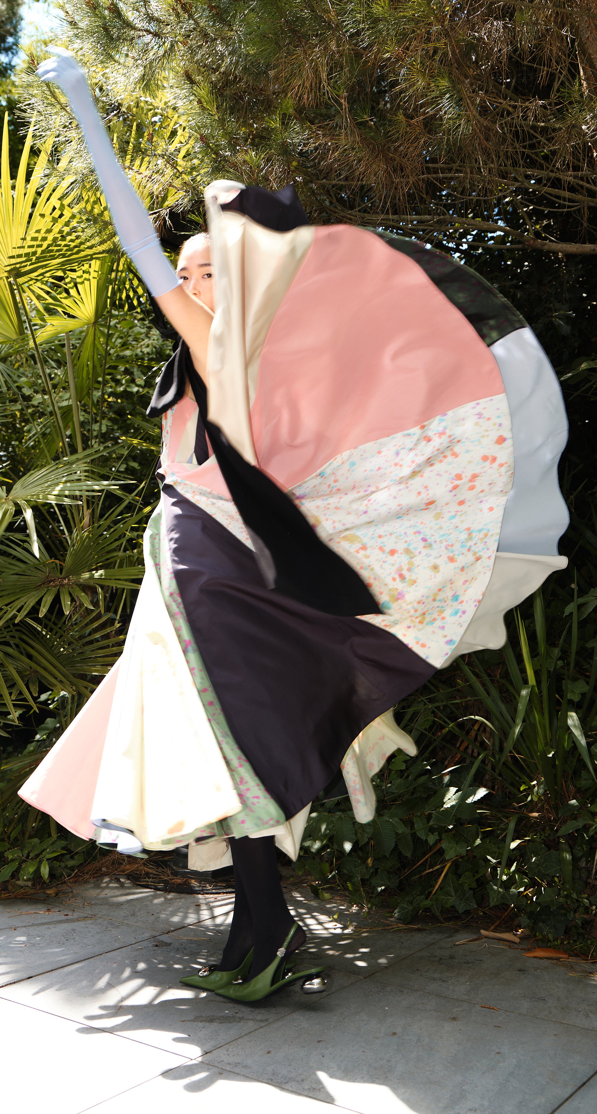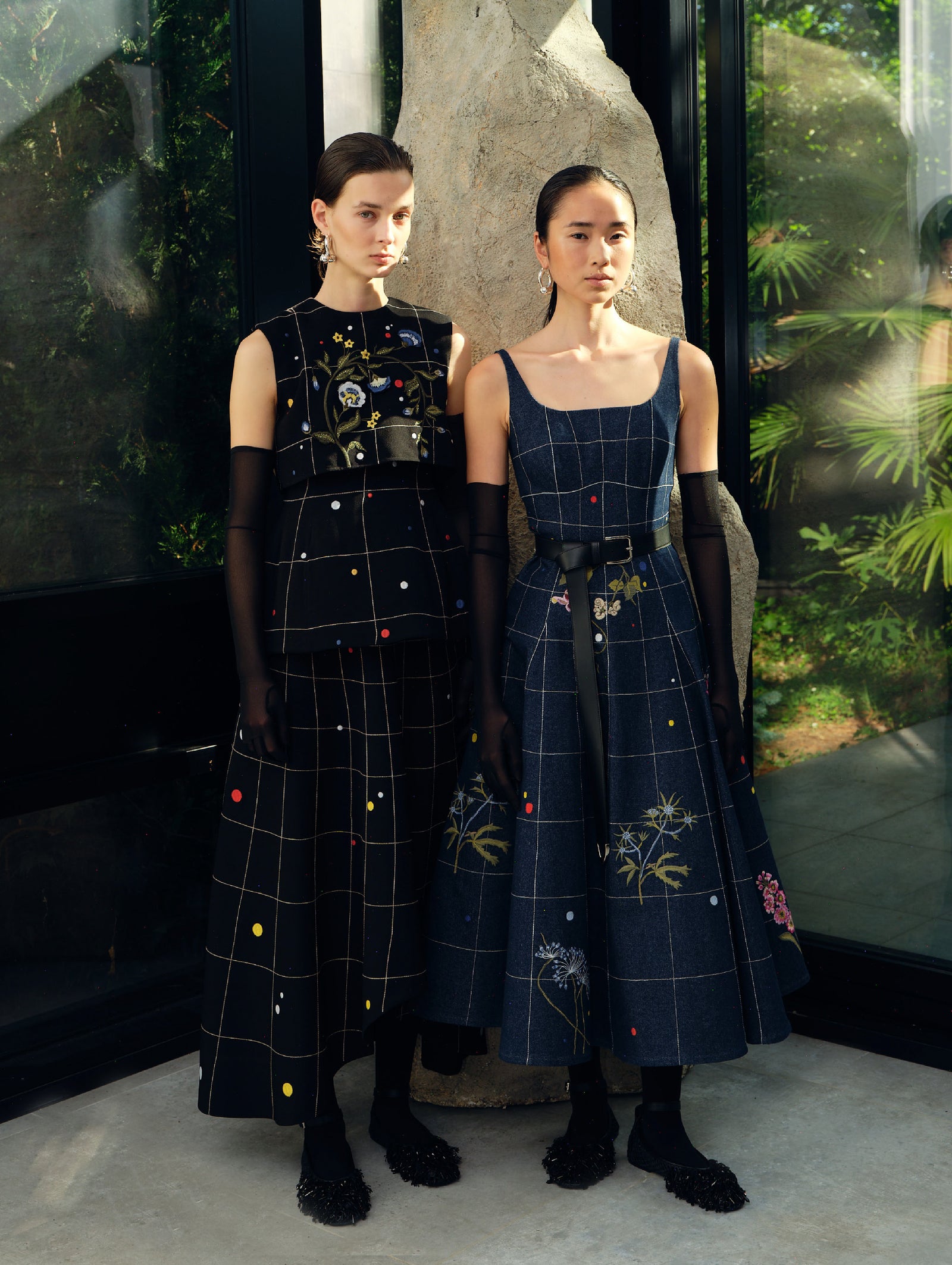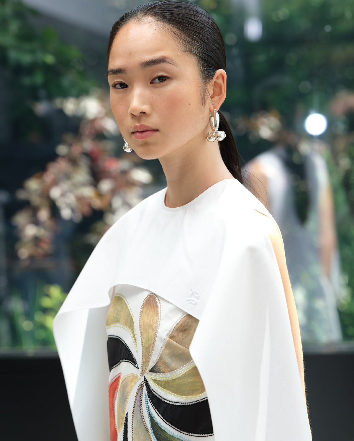 The silhouettes respond to the body, inviting the wearer into a world slightly askew, where beauty lies in alternate possibilities. Colour, too, plays a subtle game of contrast. There are calm sky blues and fertile greens, bitter marigold yellows and petal whites. Deep indigo is energised with sparks of chartreuse, and there are hints of peony-pink and torch ginger red peeking through the lineup. The combinations are sometimes unexpected, yet appear harmonious and deliberate, adding another layer of gentle disorientation. In effect, the colours further the collection’s narrative of optimism in otherness, ensuring that even in the dark of winter, light and life persist.