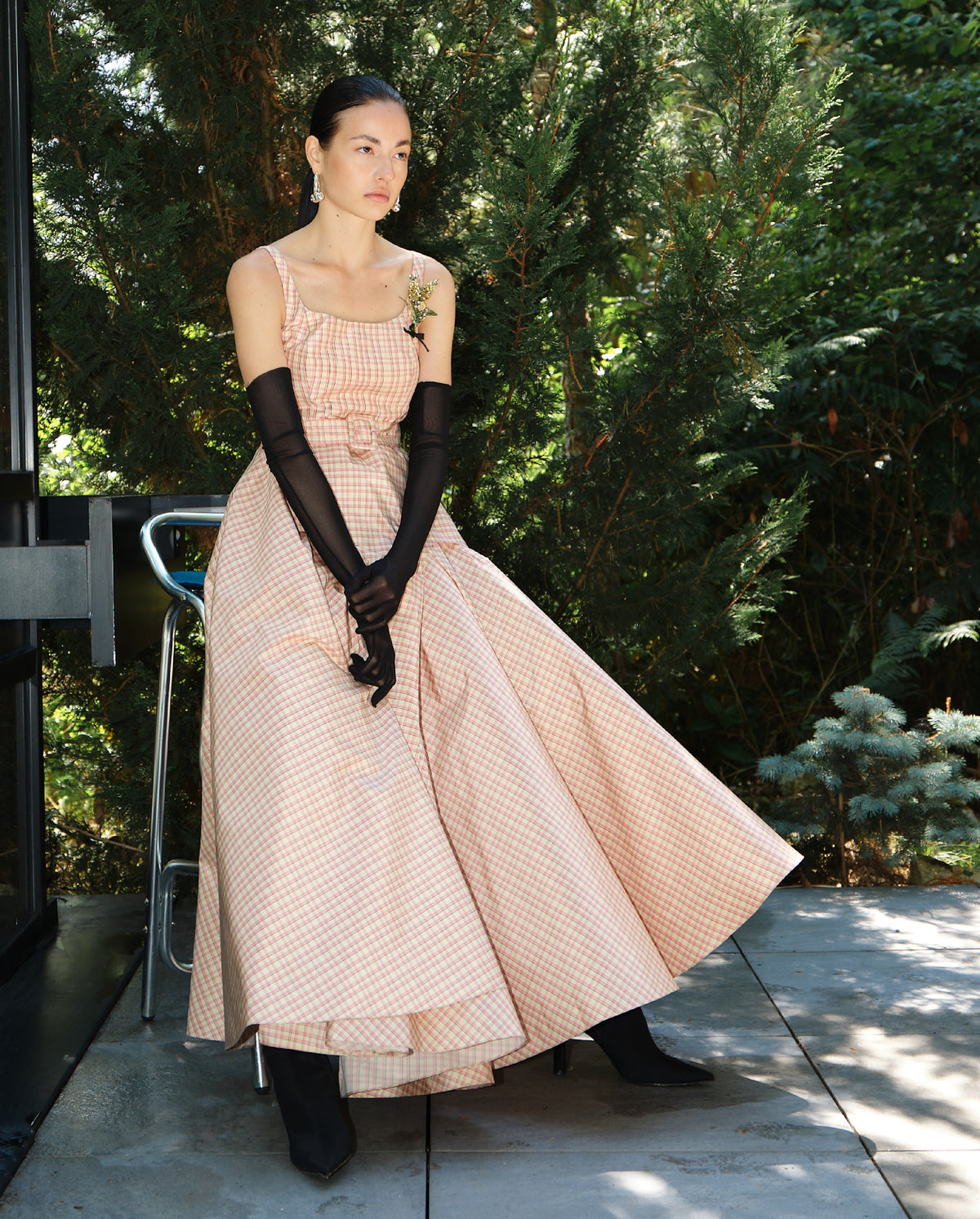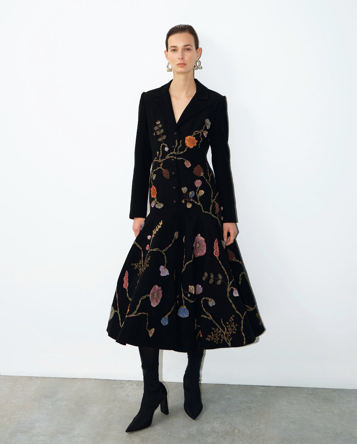 For Fall / Winter 2025, Chorus draws from the deep well of craft tradition, but tilts the lens ever-so-slightly, offer-ing garments that disorient in elegant ways. Proportions shift, surfaces surprise, and silhouettes carry echoes of something once known, now reimagined. Floral forms recur throughout the collection, embroidered, sculpted, or only implied in the fabric. These are not garden-variety blooms, but fantastical species imagined in some other realm – flowers with too many petals, leaves with memory. They emerge unexpectedly: blooming from shoulders, rippling across hems, or fracturing into delicate interconnected lace.