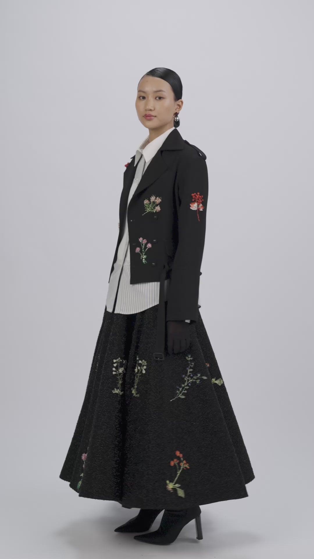 Full-sleeved jacket embroidered with floral bouquets composed of folded organza petals, organza spheres, and micro-cut leaves, each layered with crystals. Three-dimensional tubes set with crystals and new cuts interlace the surface, connecting bouquets rendered through layered needlepoint techniques.