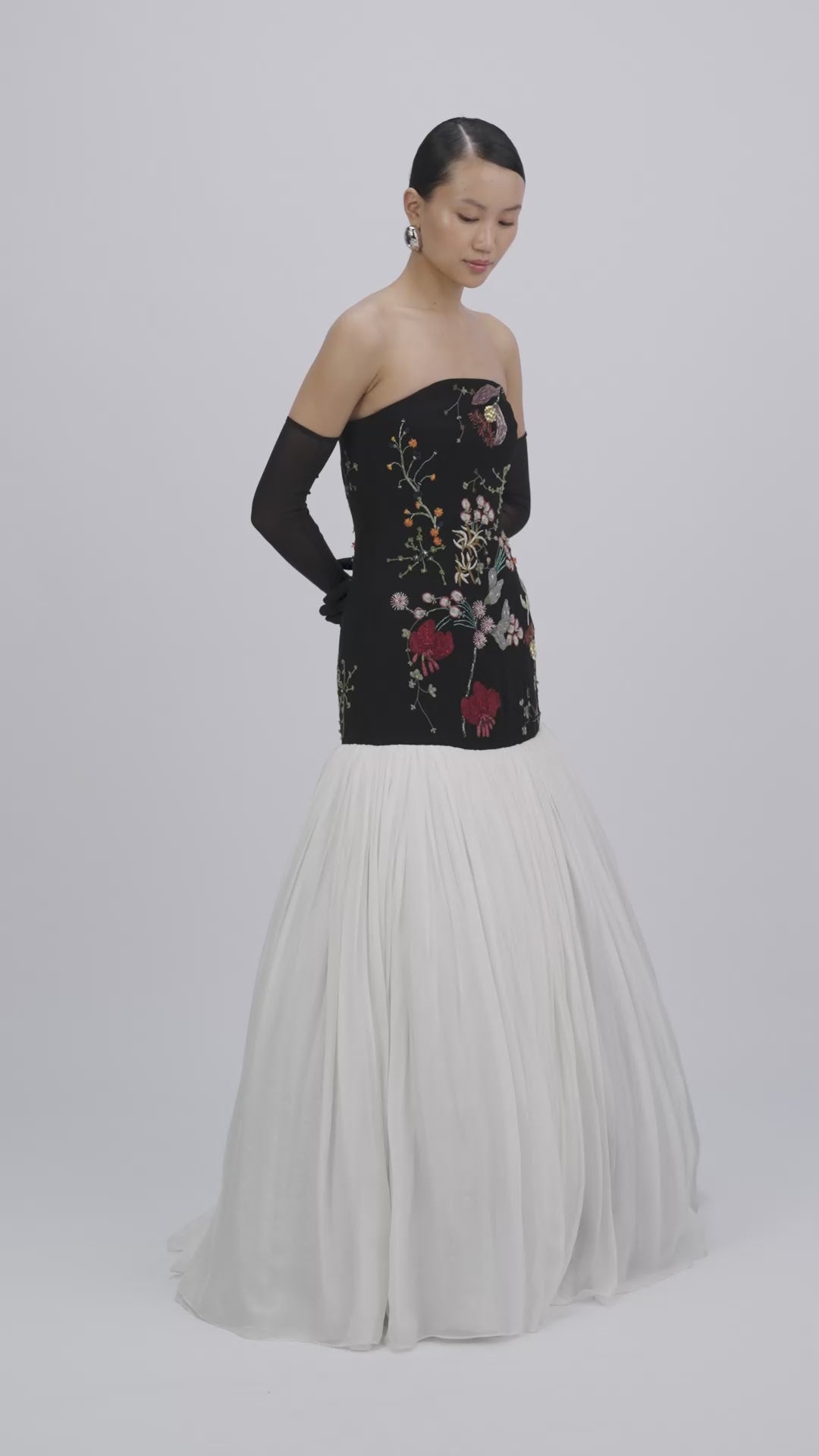 Full-length strapless dress hand embroidered with intricate floral motifs. Pleated and layered petals, worked through diverse needlepoint techniques with multifaceted crystals, micro-beads, and fine threads, form three-dimensional blossoms that shimmer across the surface.