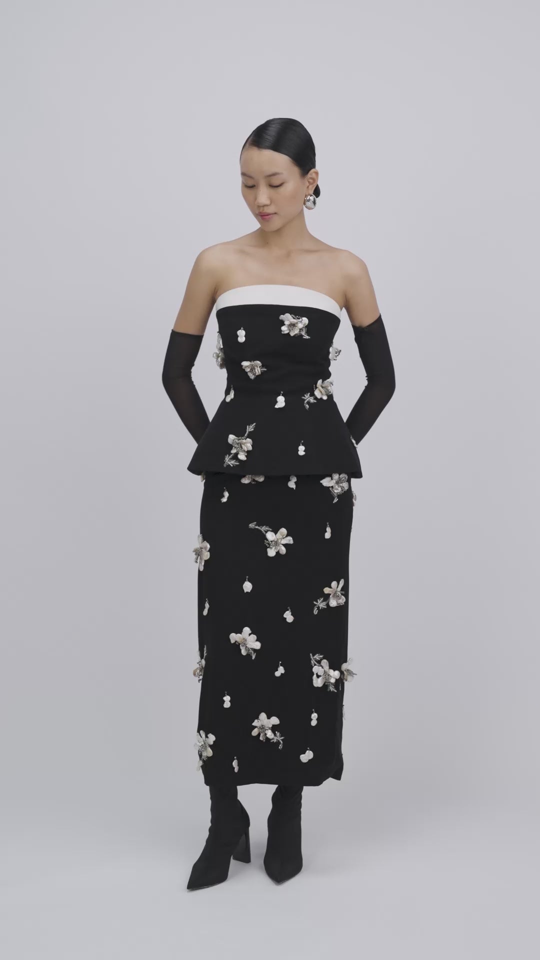 Mid-length skirt embroidered with river mother-of-pearl, crystals, and micro-caviar beads, forming organic floral compositions.