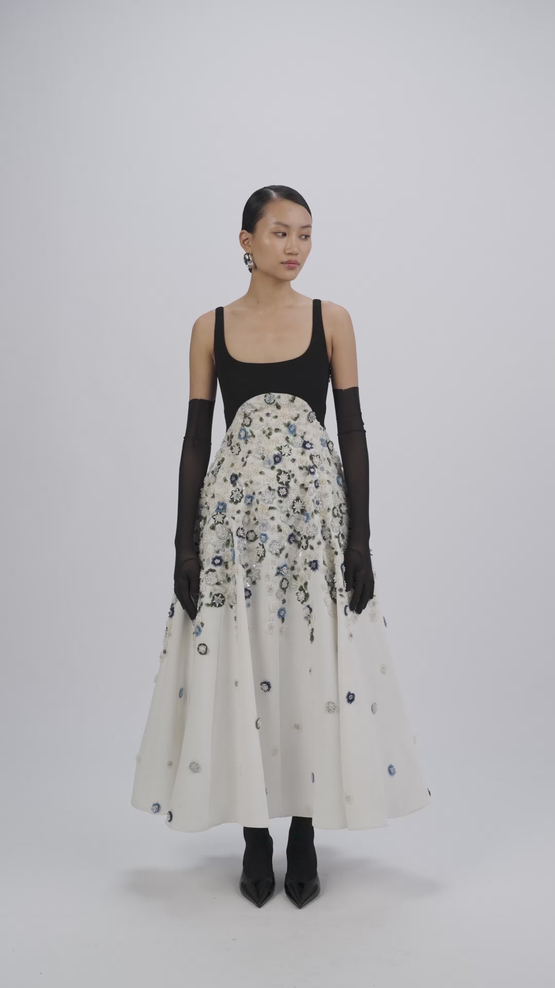 Full-length sleeveless dress with three-dimensional hand-pleated organza petals and crochet flowers, embroidered with pearls and crystals in a cascading floral composition of blue and green tones.