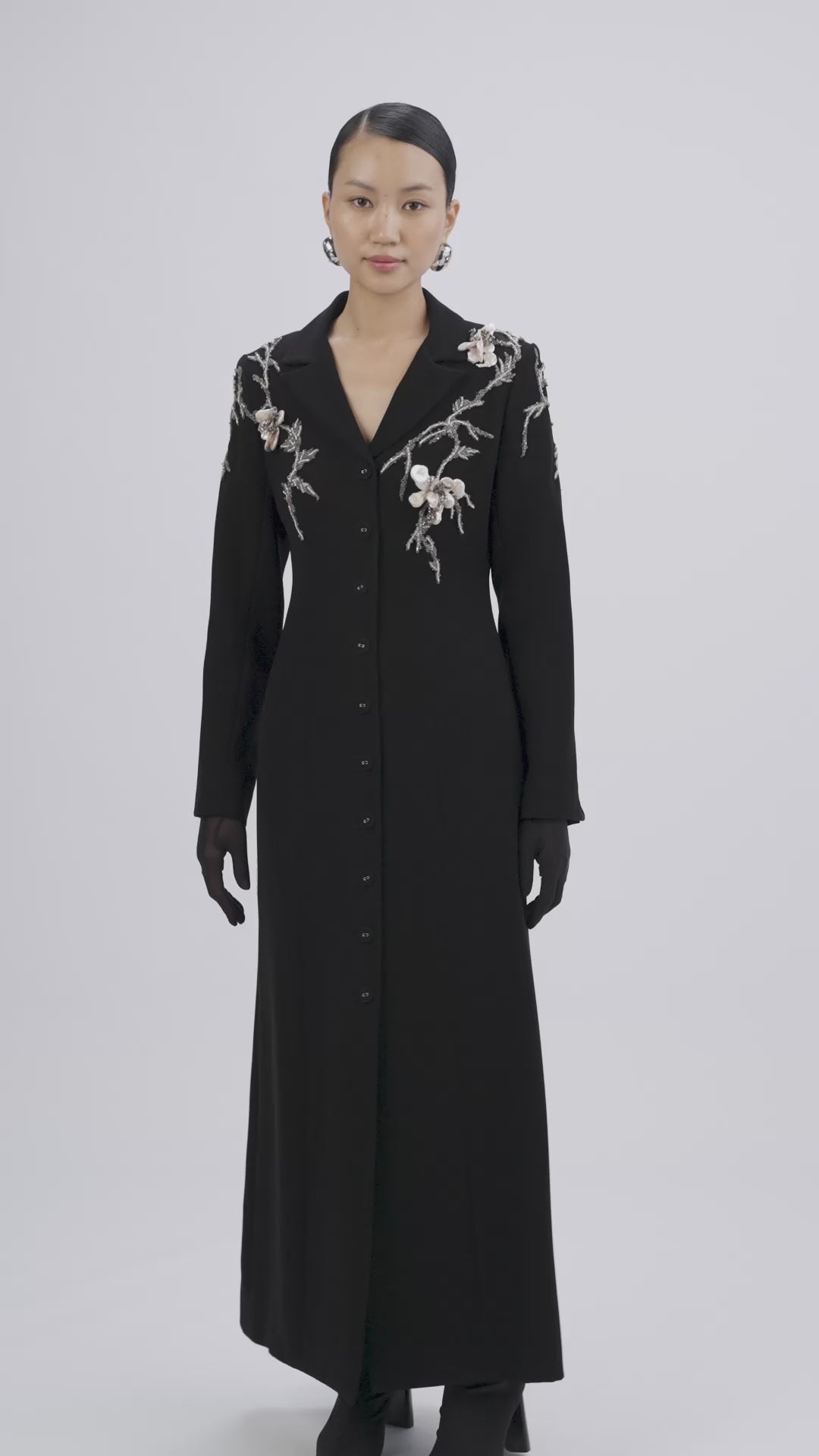 Full-length blazer dress with a tailored collar, its edges traced in hand-stitched river mother-of-pearls, caviar beads and crystal stones. Strands extend into soft macramé fringes that shift with movement.