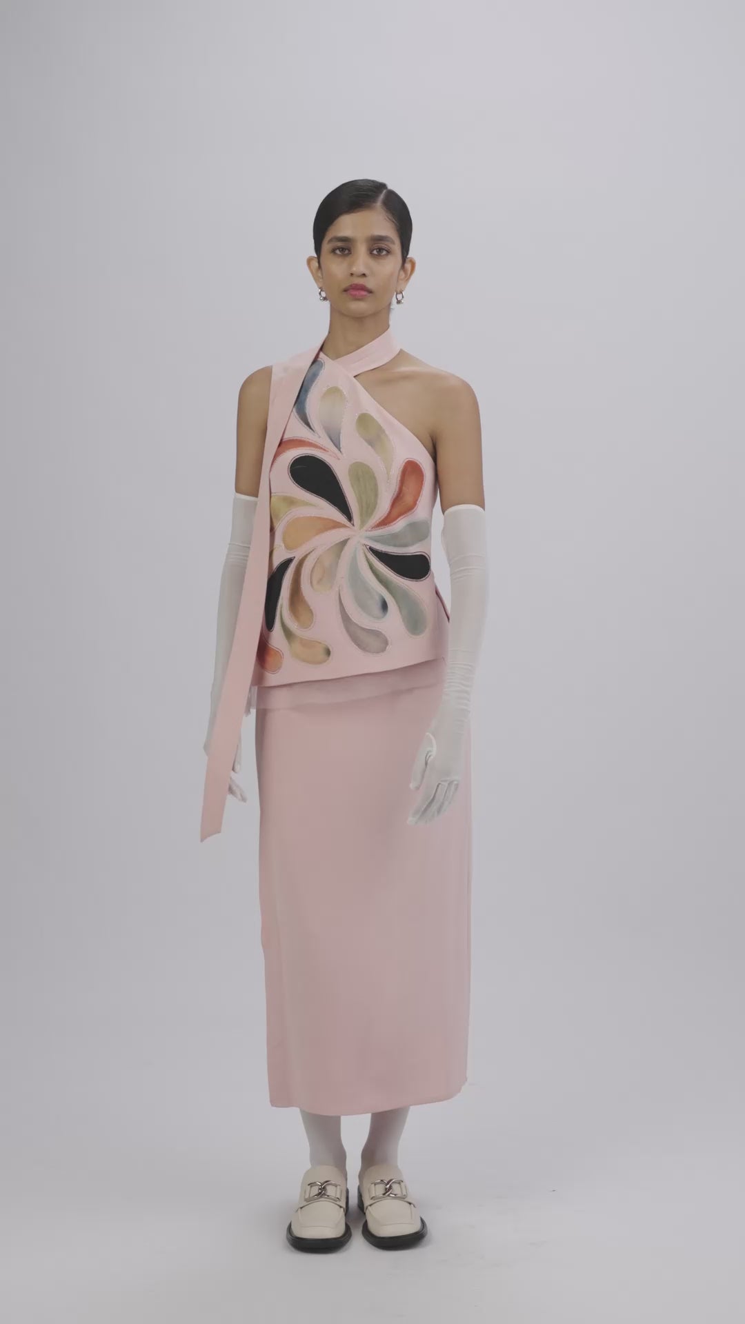 Top with a pleated scarf at the neckline. Hand-illustrated swirling comma motifs and delicate embellishments animate the surface.