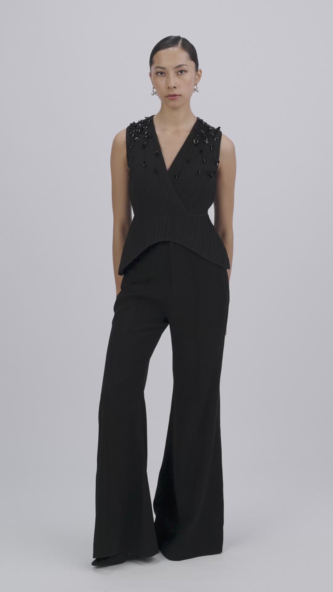 Peplum top with curved hem, mixed-media crystal clusters forming a fractured, tactile surface.