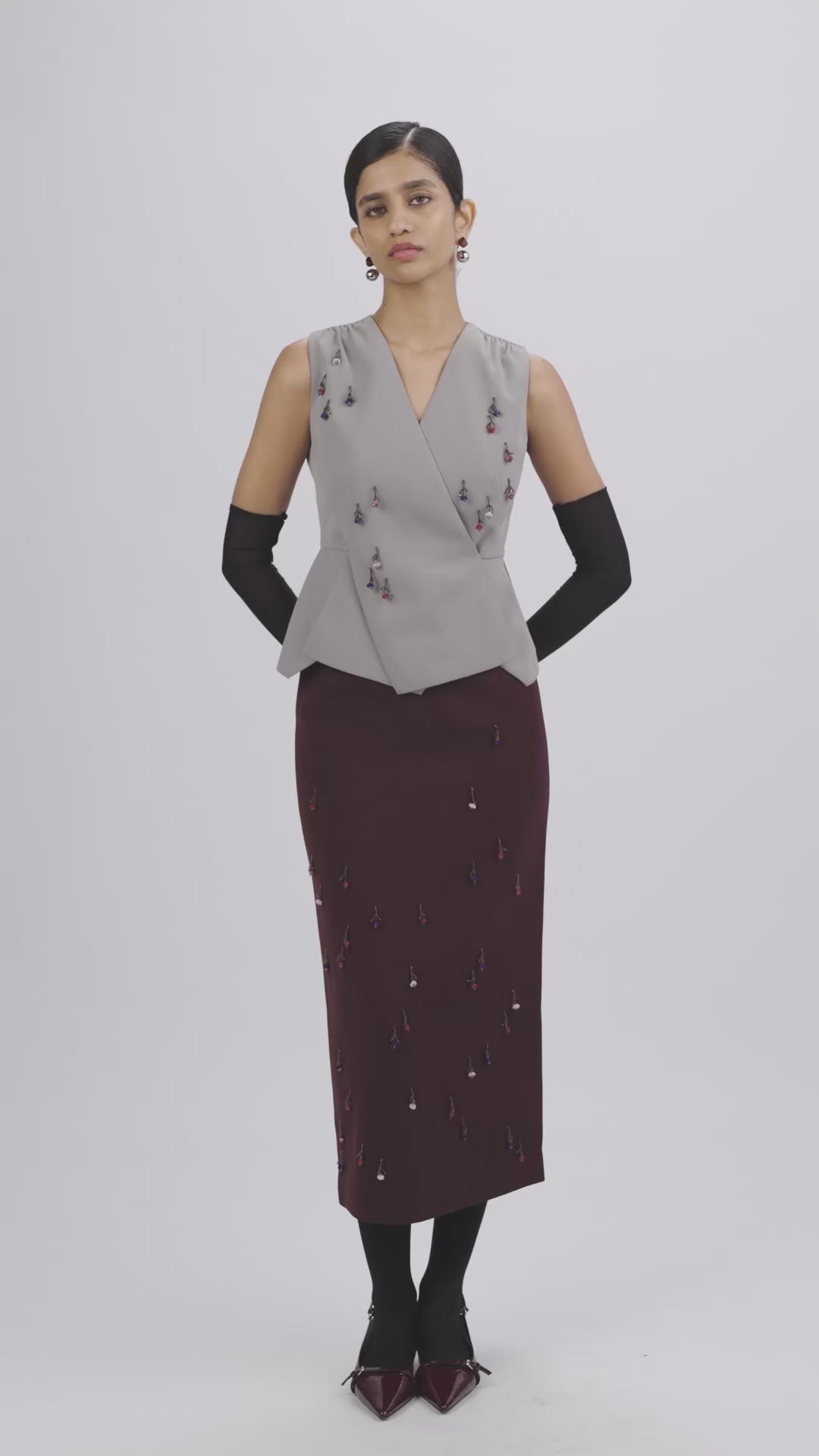 Sleeveless top with a sculpted peplum silhouette, embroidered with three-dimensional bead tassels bloom into crystalline florals.