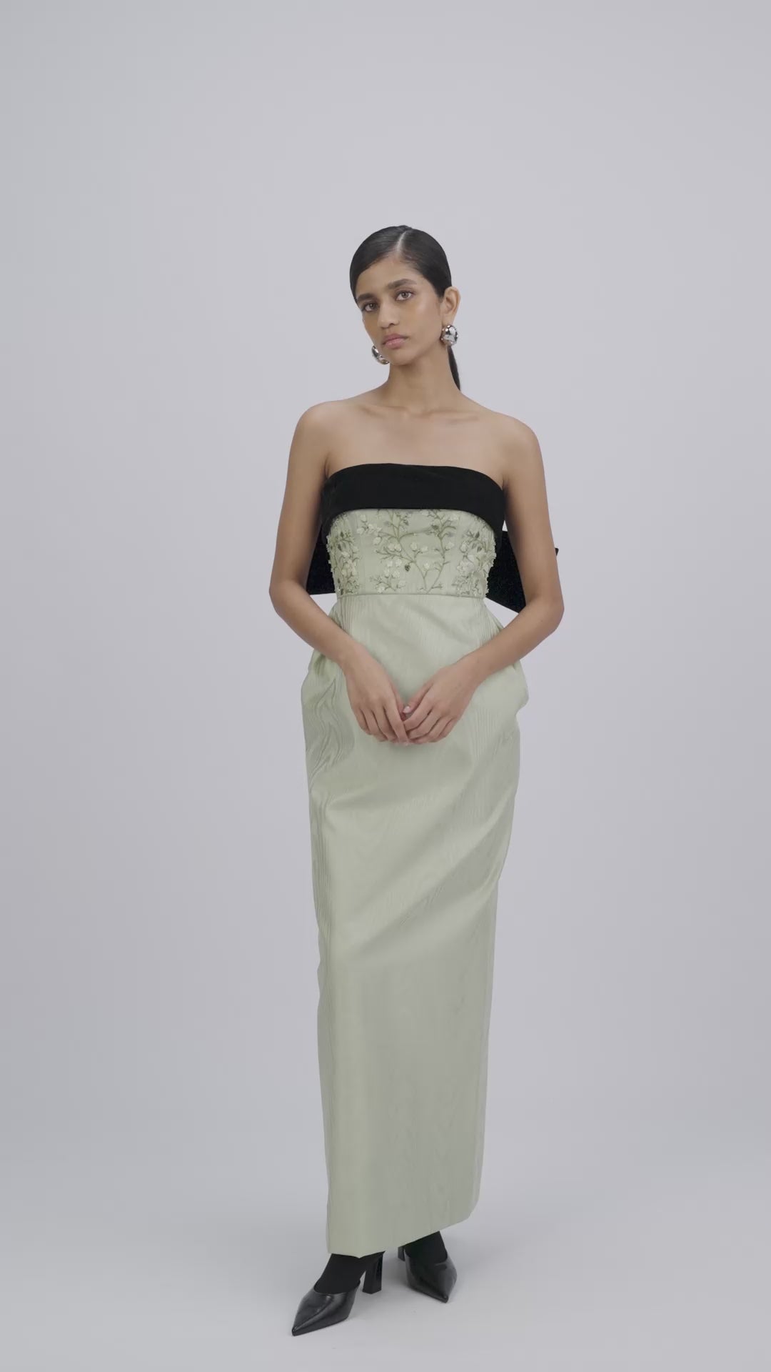 Full-length strapless dress in moiré silk with a sculpted bustier embroidered in three-dimensional micro lilies. Each bloom is crafted from layered, micro-cut petals and leaves, adorned with crystal tubes and faceted stones. The silhouette concludes in a bow of black silk velvet, a sculptural counterpoint to the intricacy above.