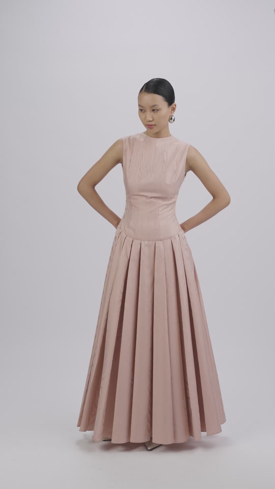 Full-length dress in pink moiré silk, featuring a fitted bodice that releases into pleats, building volume and movement below the waist.