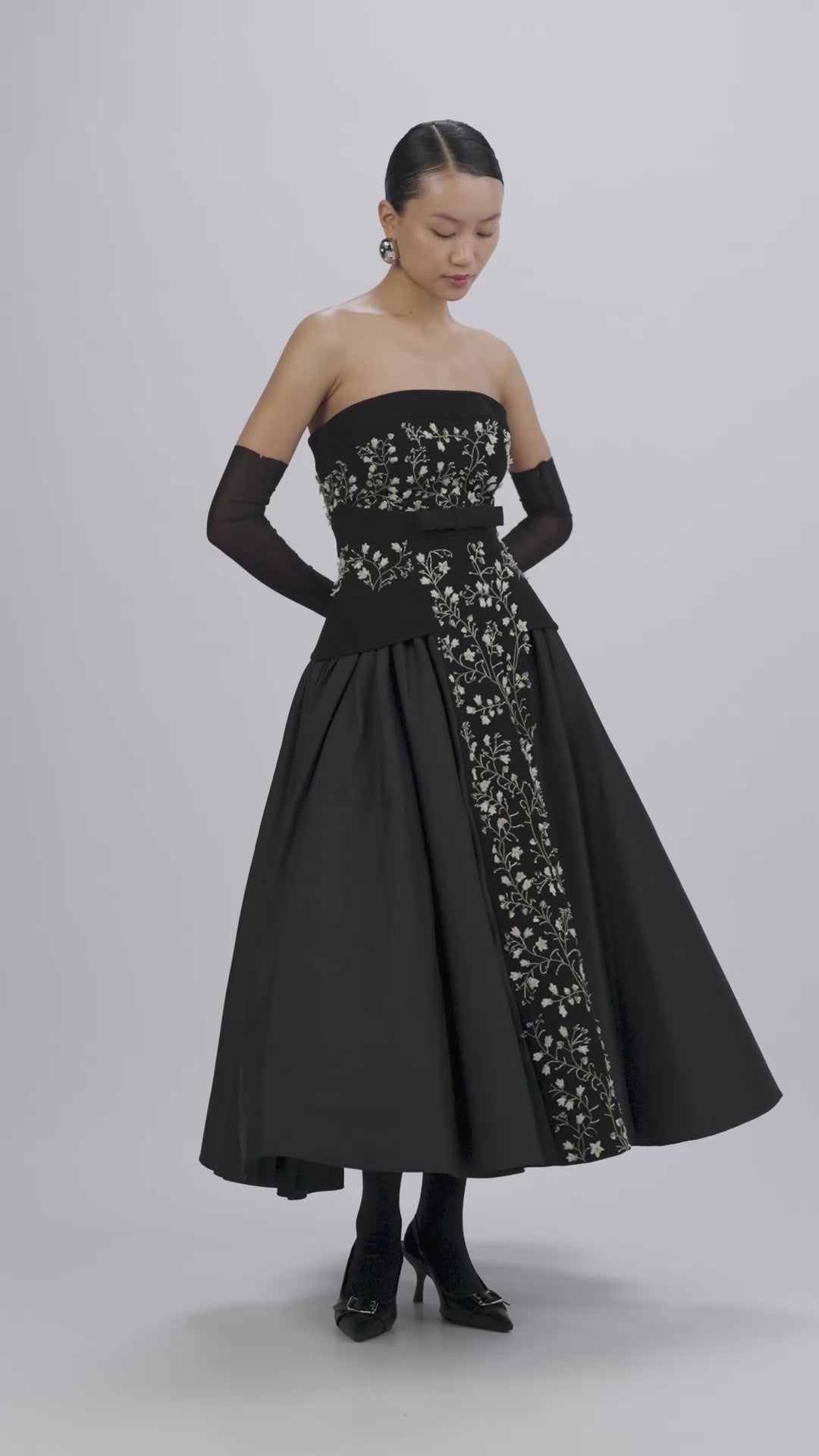 Mid-length strapless dress with elaborately embroidered three-dimensional lilies and foliage. Each layered petal, detailed with tubular beads and multifaceted crystals, catches the light as the dress shifts.