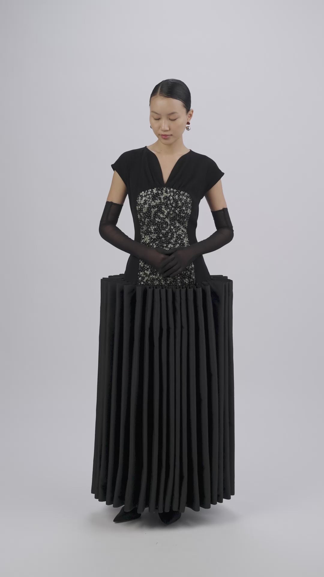 Full-length dress featuring a central panel of micro three-dimensional floral embroidery, scattered with crystal caviar, descending into a skirt articulated by tension-and-release pleats.