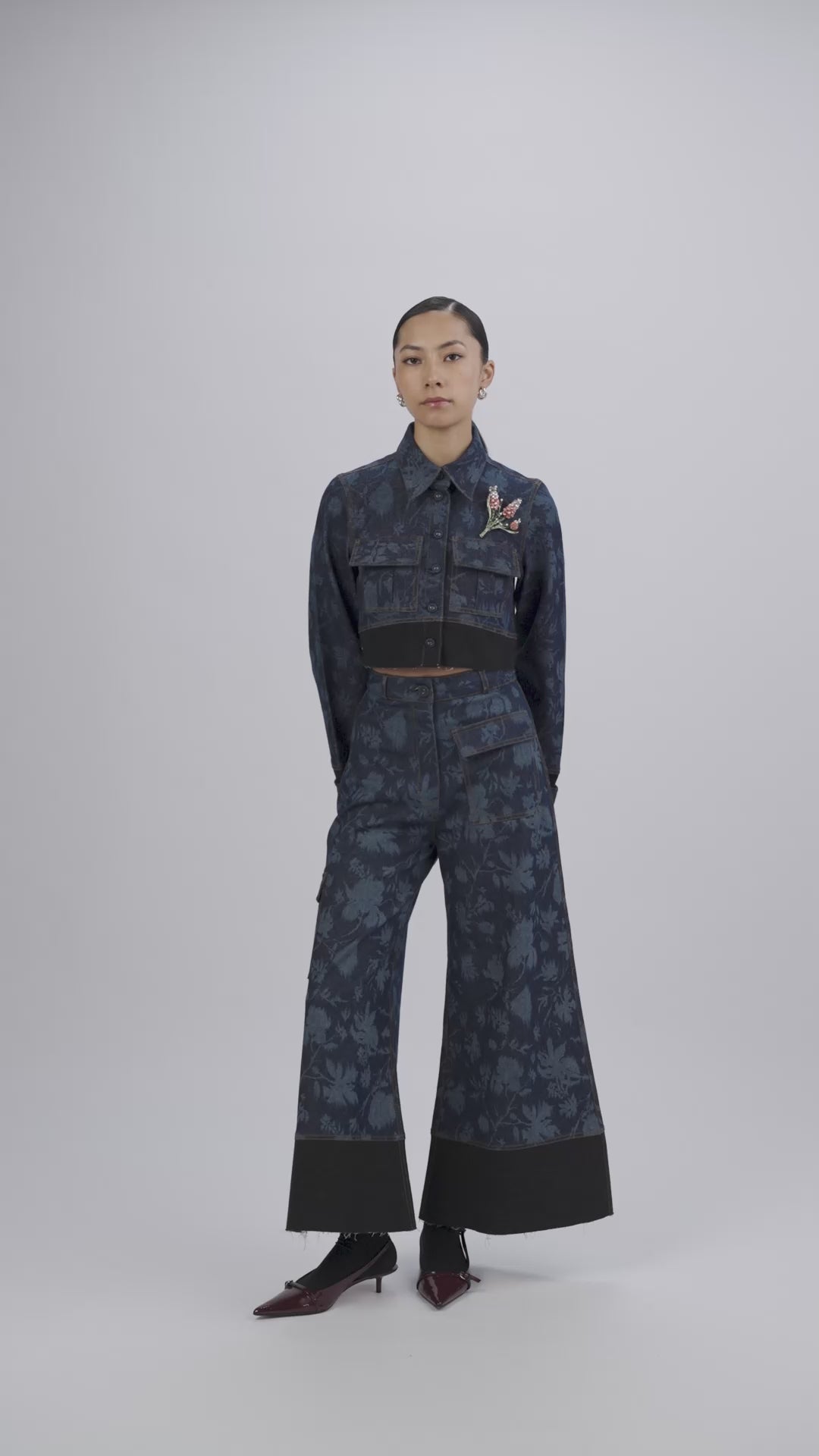 Denim pants in naturally dyed indigo, its surface etched with diffused florals and finished with contrast topstitching and flap pockets.