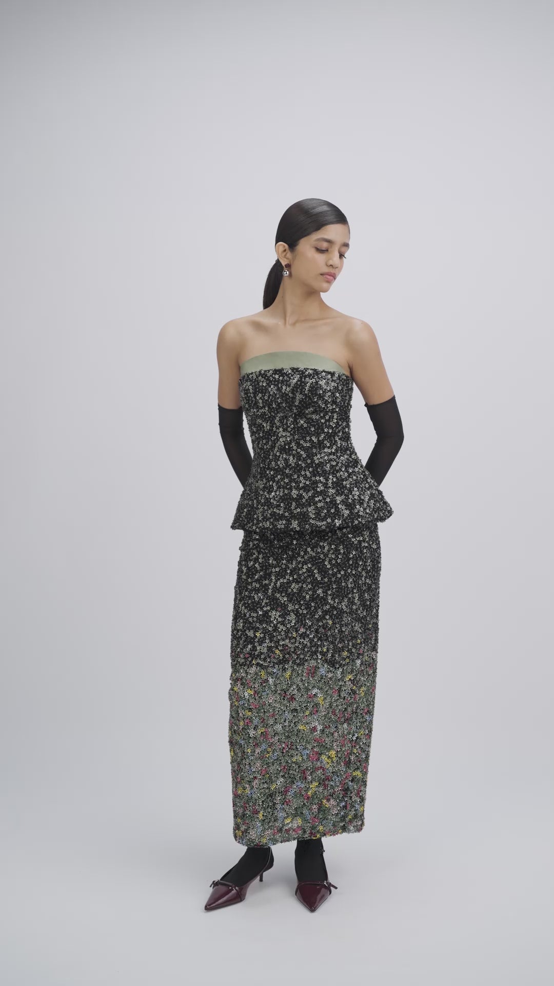 Strapless corset embroidered with dense constellations of micro-flowers, each centred with a crystal, rendered in gradient tones and black and sage green.