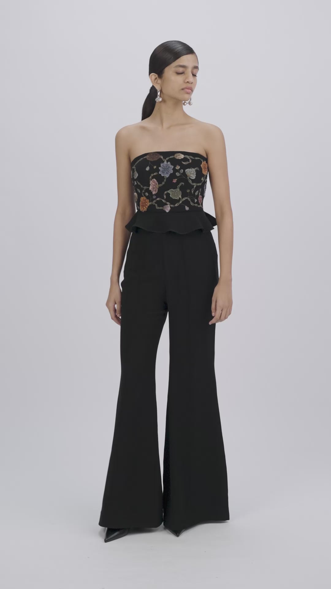 Corset top with a voluminous hem. Hand-painted floral appliqués are layered and embroidered with crystals and micro-beads, transforming botanicals into otherworldly forms.