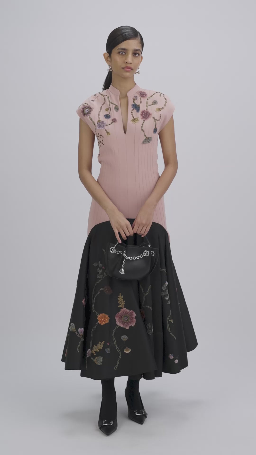 Mid-length panelled dress with a full hem. Hand-painted appliqué flowers layered with crystal and micro-bead embroidery transform botanicals into otherworldly forms.