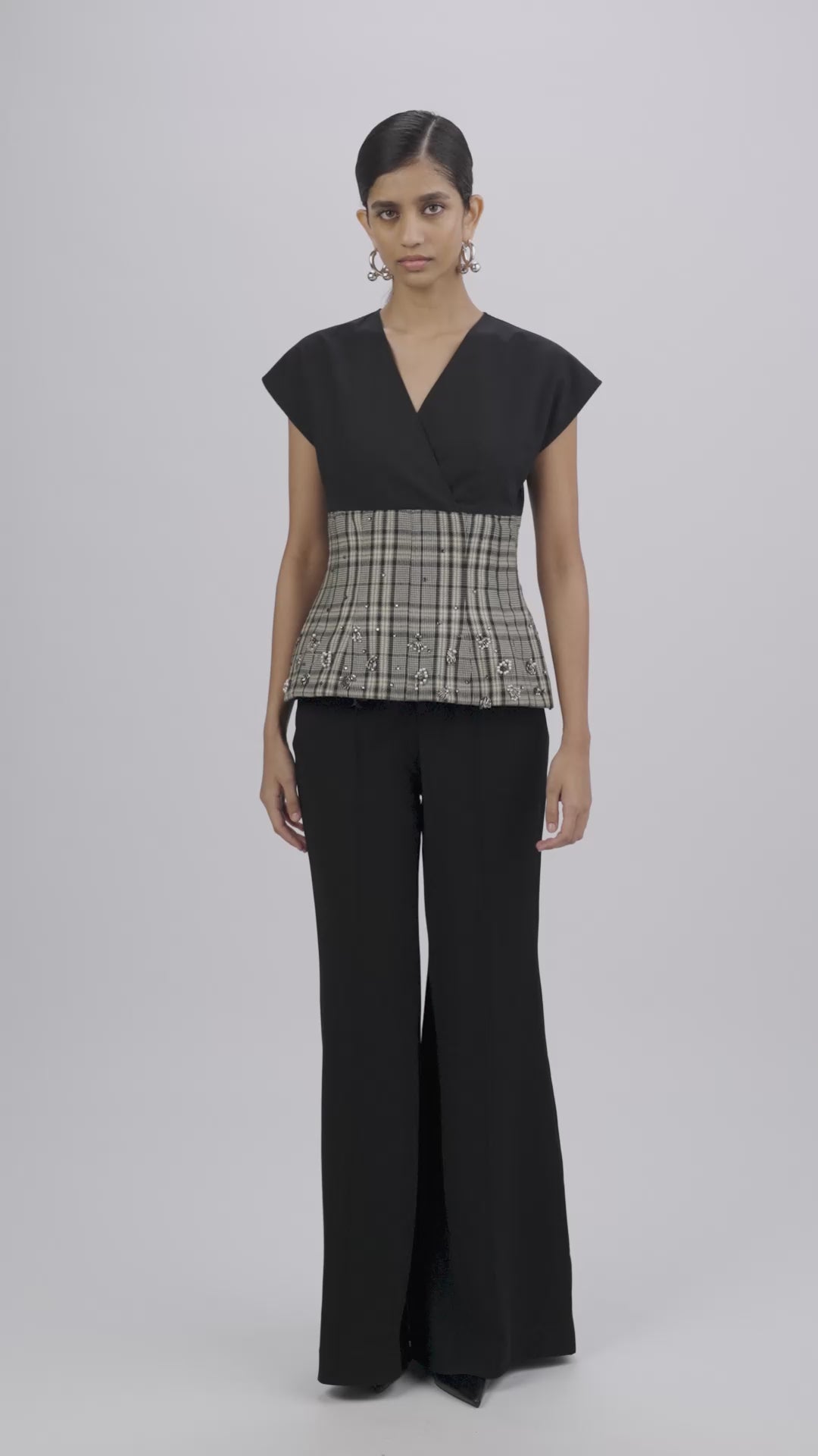 Peplum corset top adorned with clusters of pearls, studs, and silver micro-cut beads. Black poplin overlap panels and kimono sleeves introduce contrast and volume.