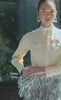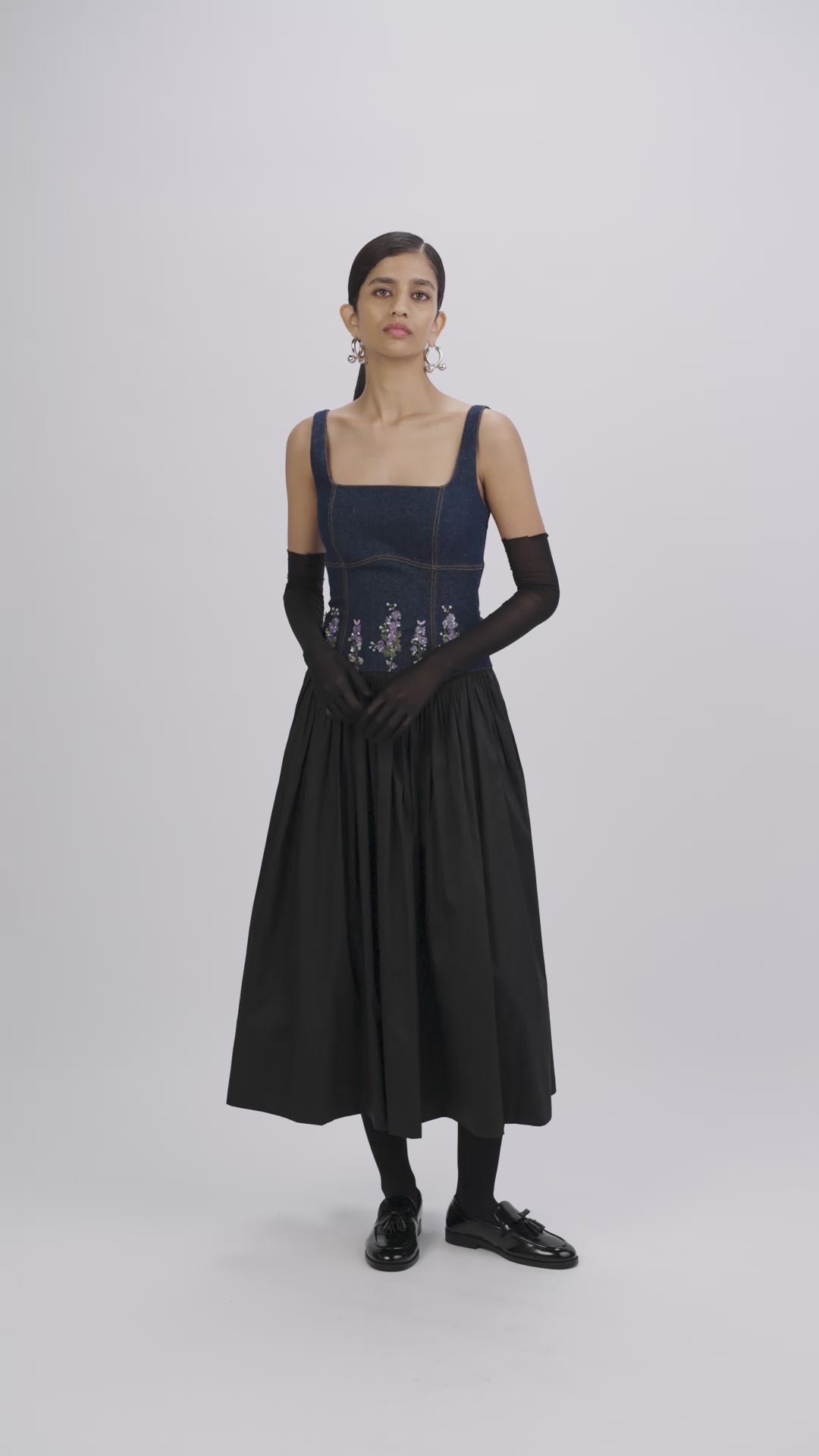 Mid-length denim dress with contrast topstitching, embellished with three-dimensional bouquets of sequins, crystals, micro-beads, and organza flowers.