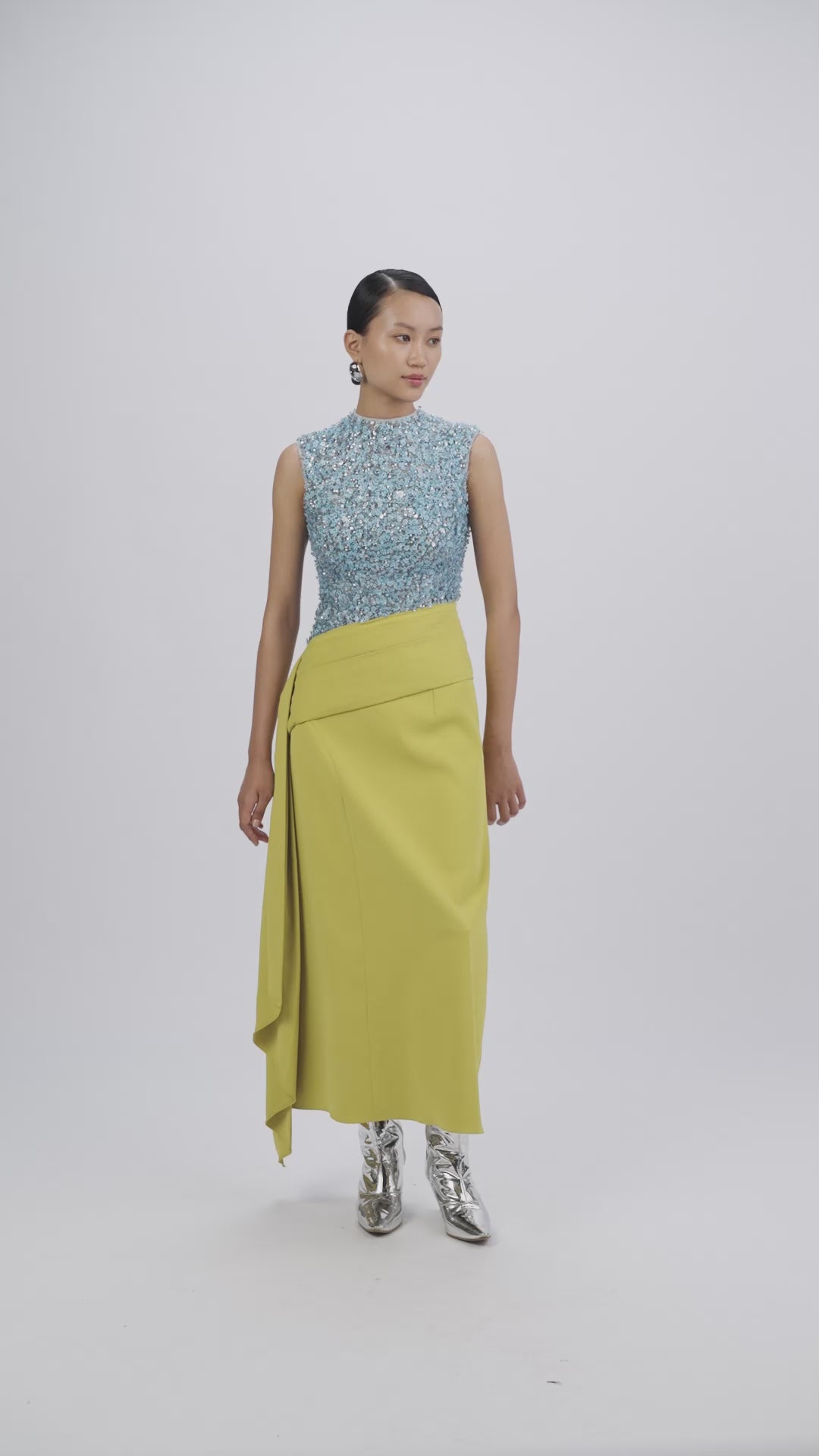 Mid-length sleeveless dress with a contoured bodice embroidered in a grid of micro-caviar beads. Three-dimensional florals in micro-cuts and crystals disrupt the order, while a blue draped skirt gathers at the waist, unfolding in sculptural volume.