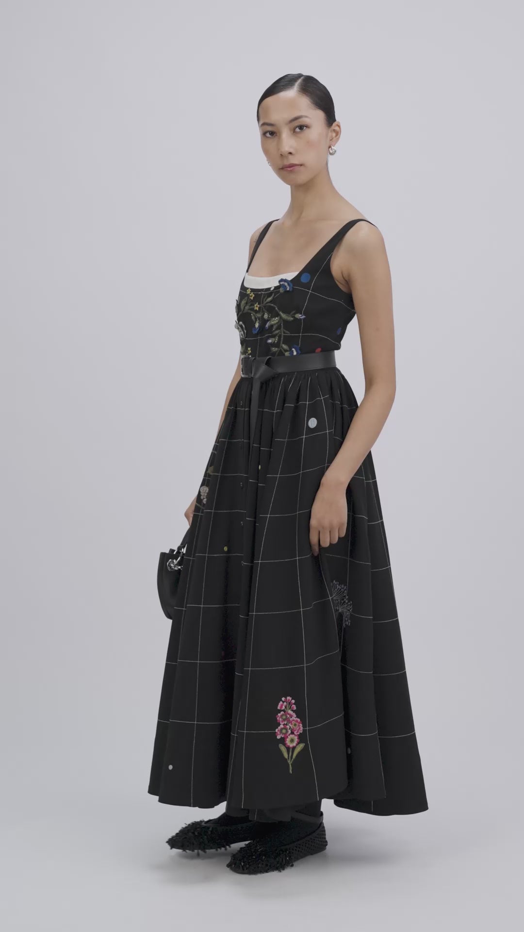 Mid-length dress with white detailing at the neckline, embroidered with fine threads tracing a cosmic grid across the surface, punctuated at its intersections with three-dimensional florals.