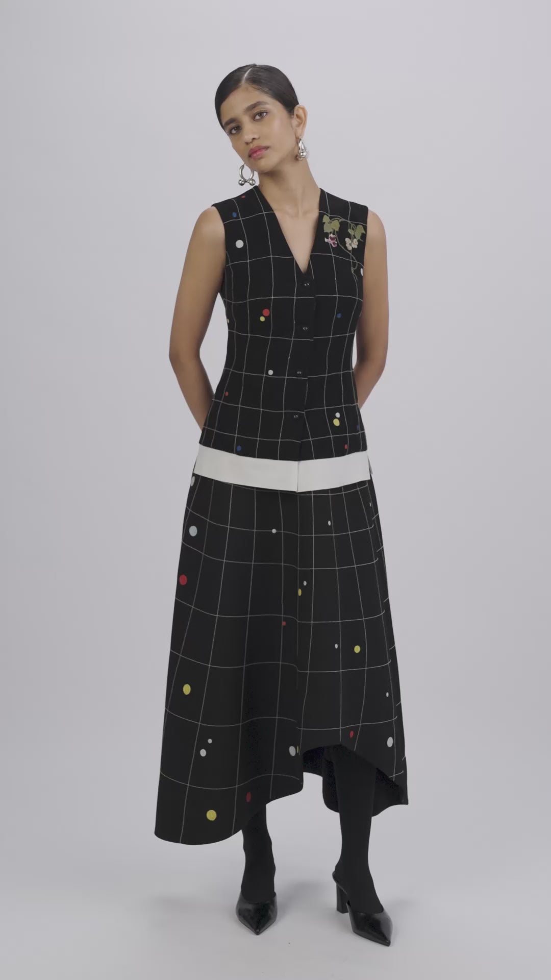 Sleeveless vest with a white hem, embroidered with fine threads tracing a cosmic grid across the surface, punctuated at its intersections with three-dimensional florals.
