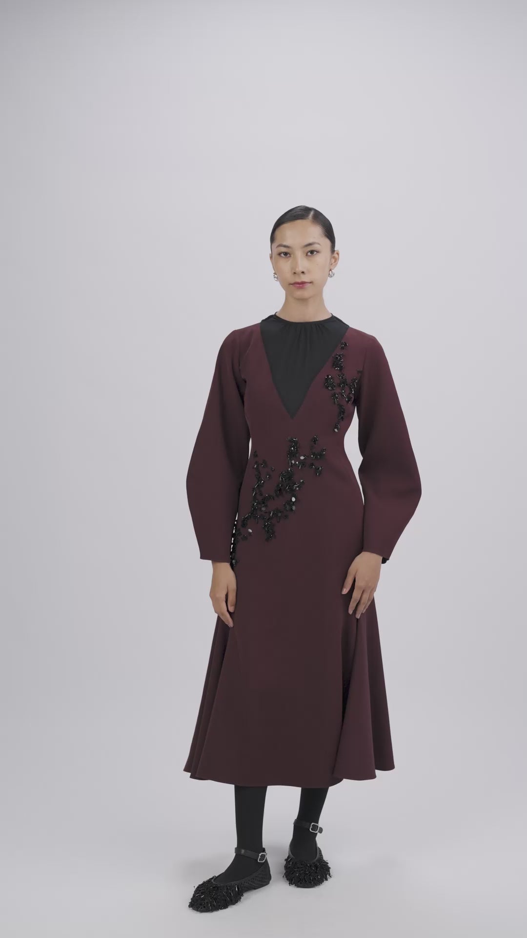 Mid-length dress with a gathered georgette neckline, crystal clusters forming a fractured, tactile surface.