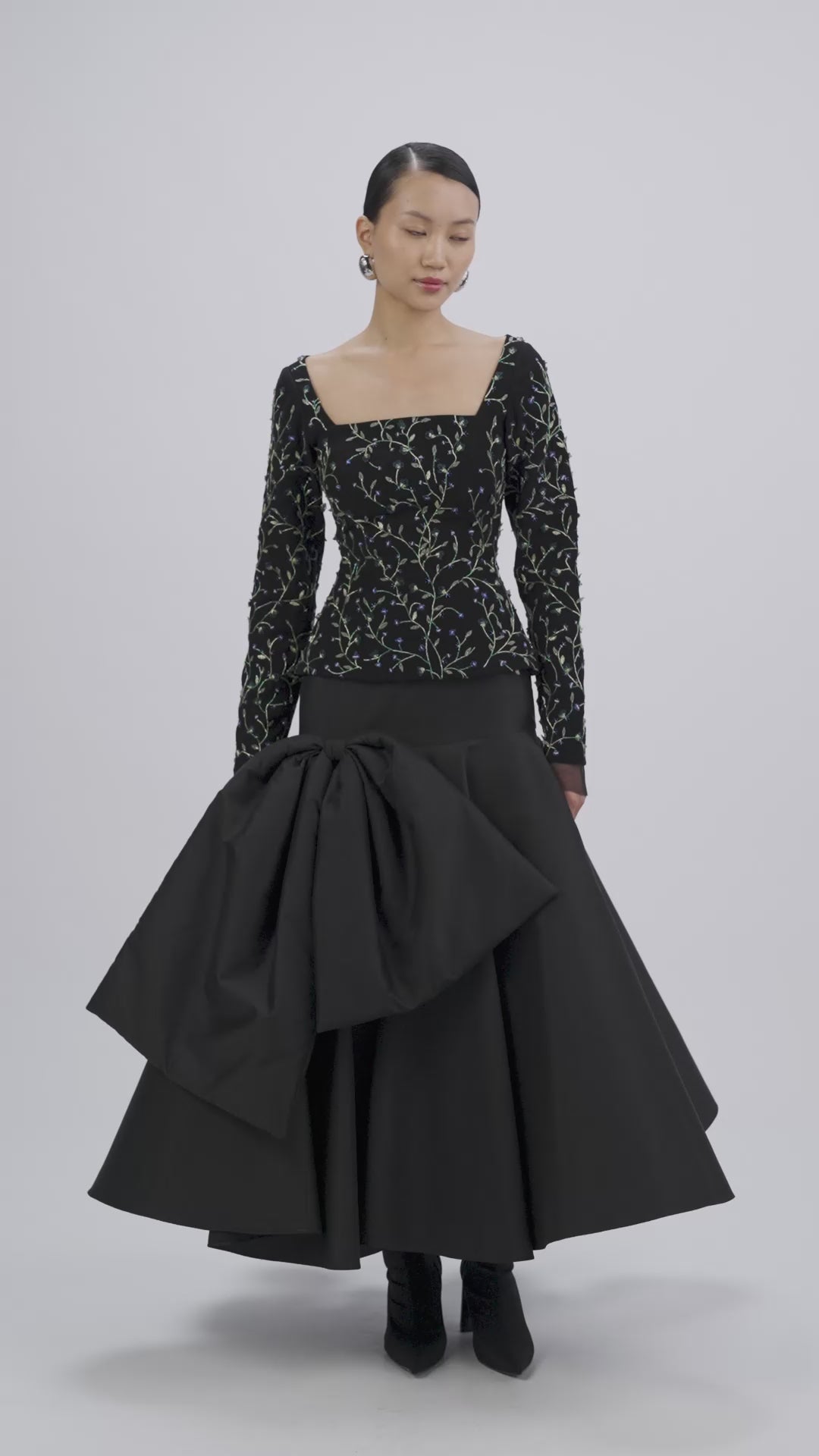 Full-sleeved top hand embroidered with three-dimensional organza micro-flowers and multifaceted crystals.