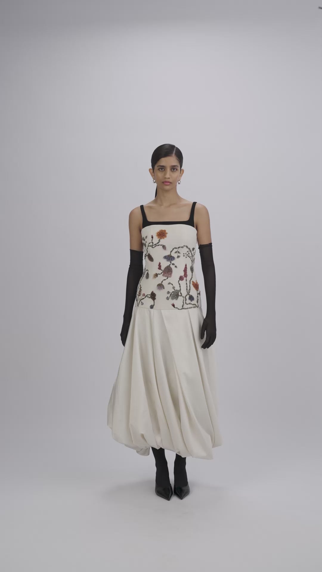 Mid-length dress with a fitted bodice. Hand-painted floral appliqués are layered and embroidered with crystals and micro-beads, transforming botanicals into otherworldly forms.