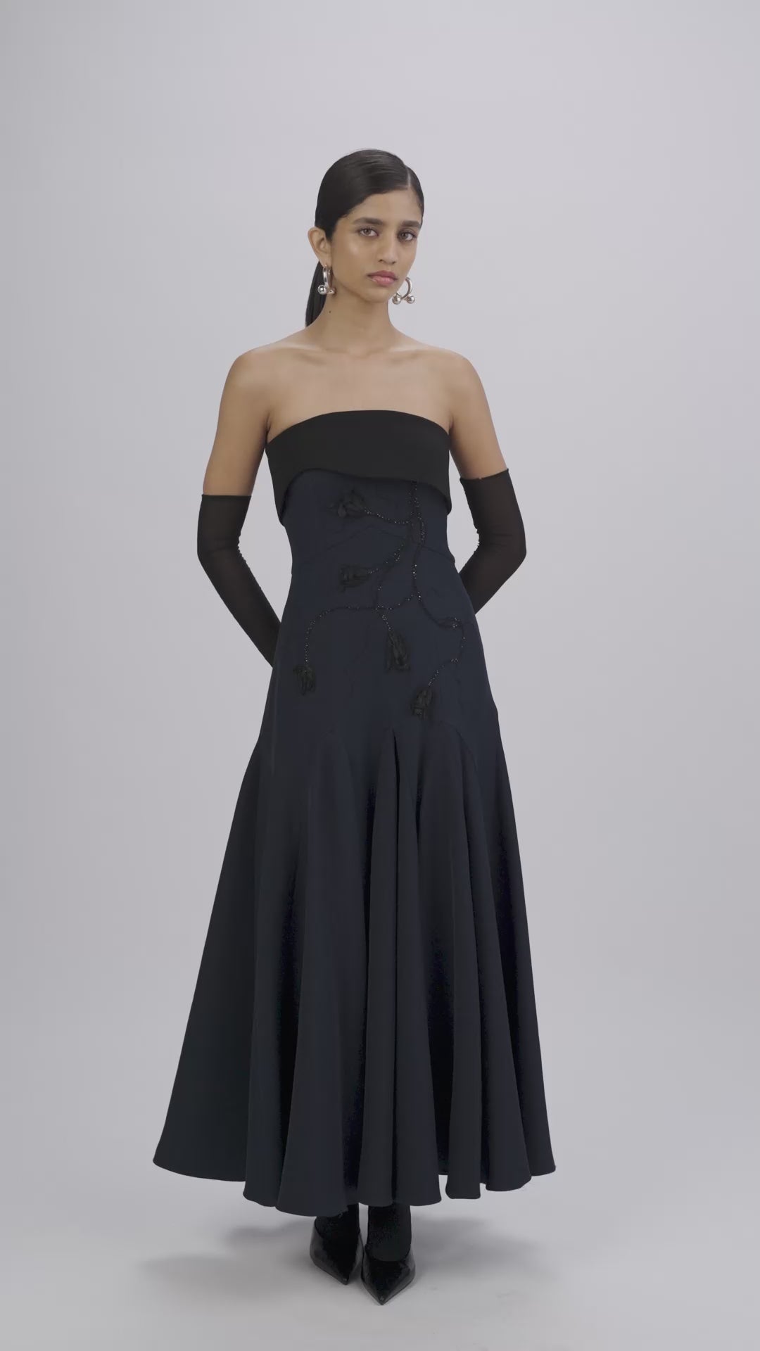 Strapless mid- length dress with a draped neckline and voluminous godets. Hand-embroidered threadwork with micro-beads and three-dimensional organza flowers trace the surface.
