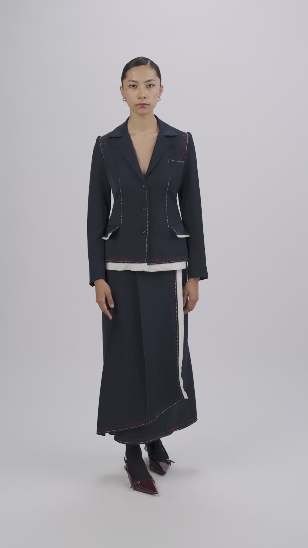 Double-breasted jacket with contrasting basting stitches across the bodice, turning the provisional marks of couture tailoring into deliberate, permanent surface detail.
