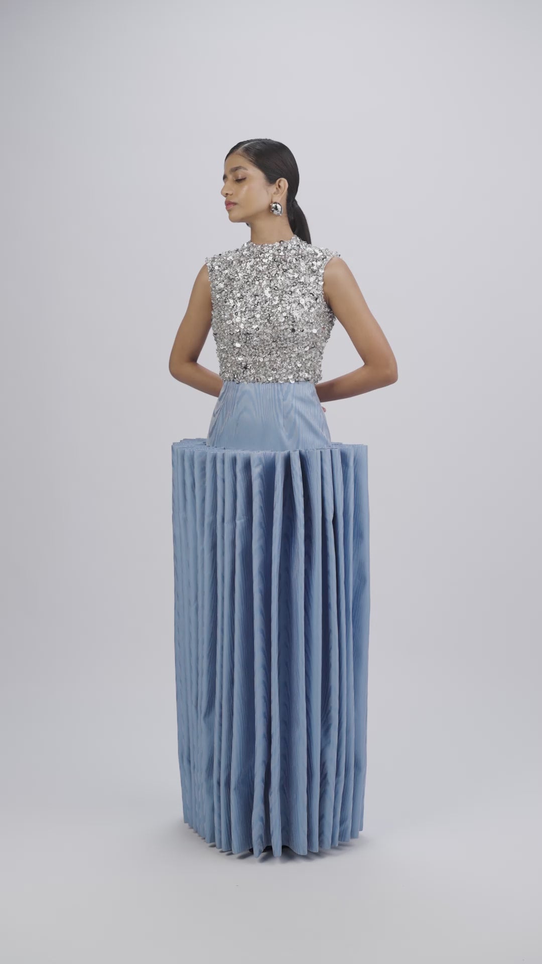 Full-length skirt in silk moiré, its rippled surface shaped by tension-and-release pleats.