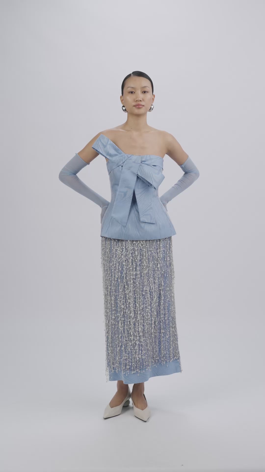 Strapless moiré silk top with a rippling, water-like surface. Structured in form and finished with a front bow.