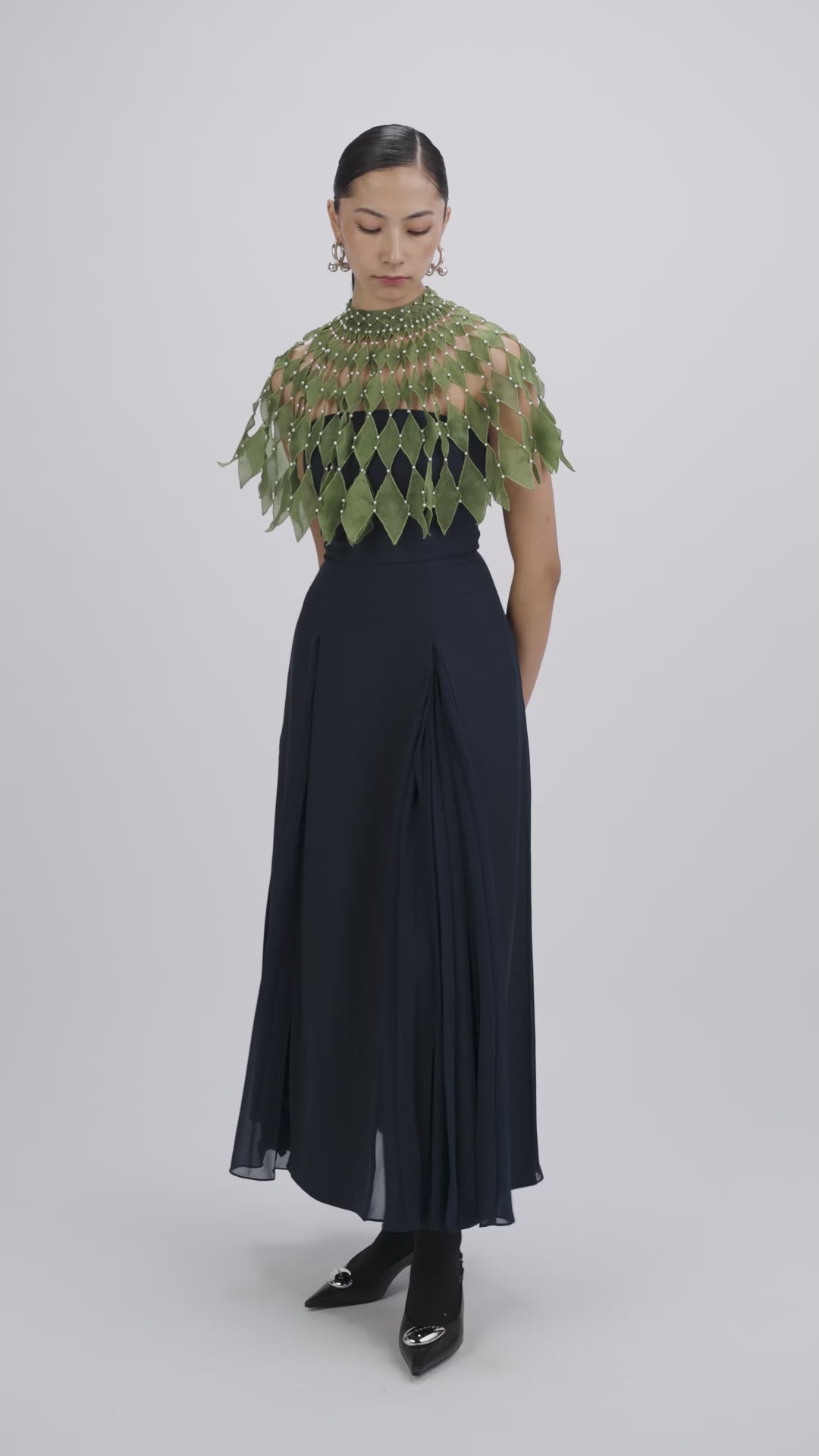 Mid-length dress with inserted godets that open into pleats, the structure flowing into a flared hem.