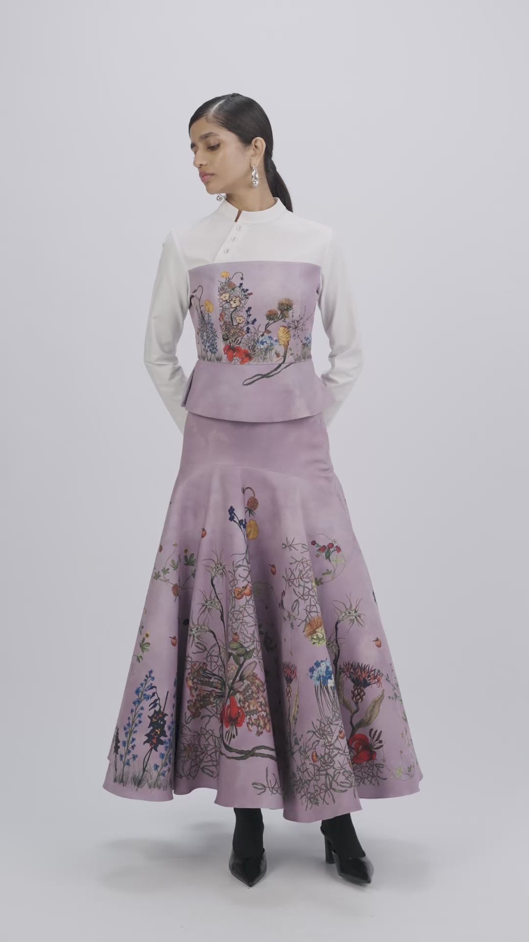 Mid-length skirt in the Twilight Bloom print—hand-illustrated botanicals at dusk. Fitted at the waist, it opens into a voluminous hemline.
