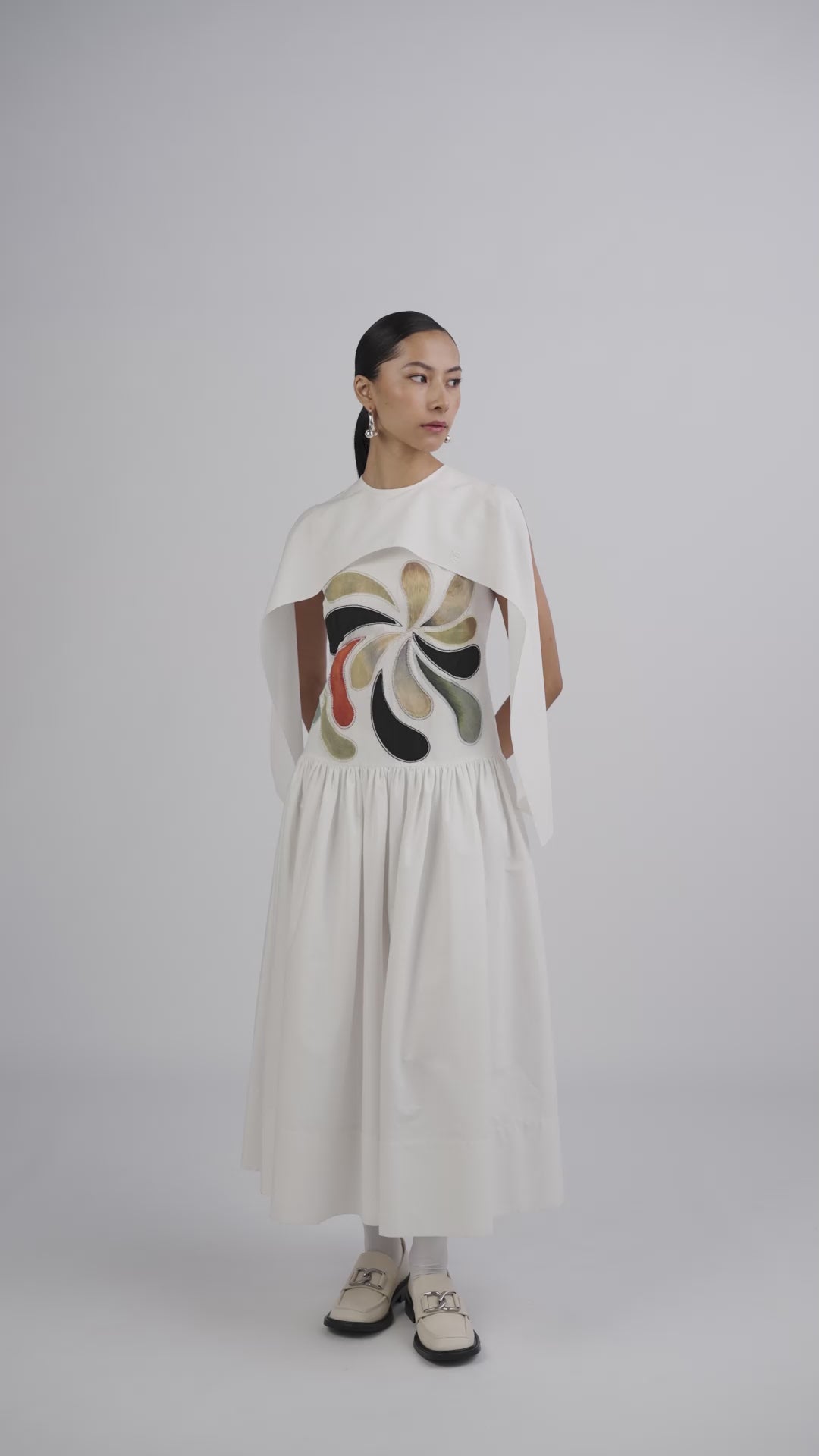 Mid-length dress with an extended draped panel and gathered waist. Hand-illustrated swirling comma motifs and delicate embellishments animate the surface.