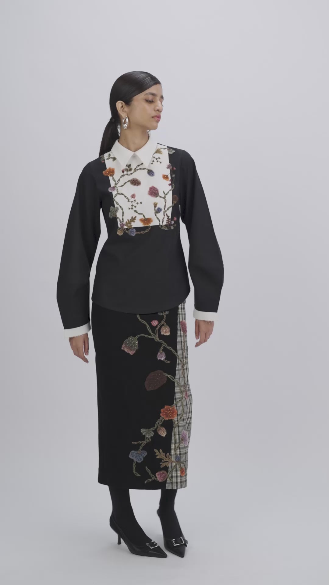 Straight mid-length skirt with a plaid panel. Hand-painted floral appliqués are layered and embroidered with crystals and micro-beads, transforming botanicals into otherworldly forms.