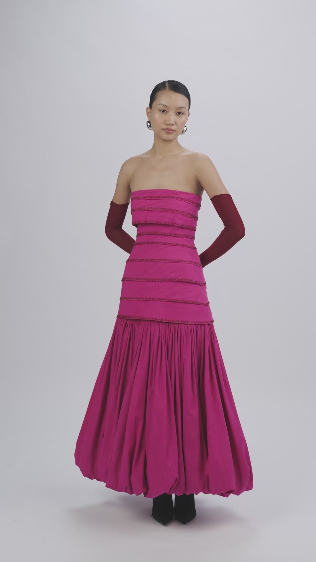 Mid-length strapless moiré silk dress, its rippled surface traced with crystal-embroidered bands and micro-beads along the bodice, falling into a voluminous skirt with a gathered balloon hem.