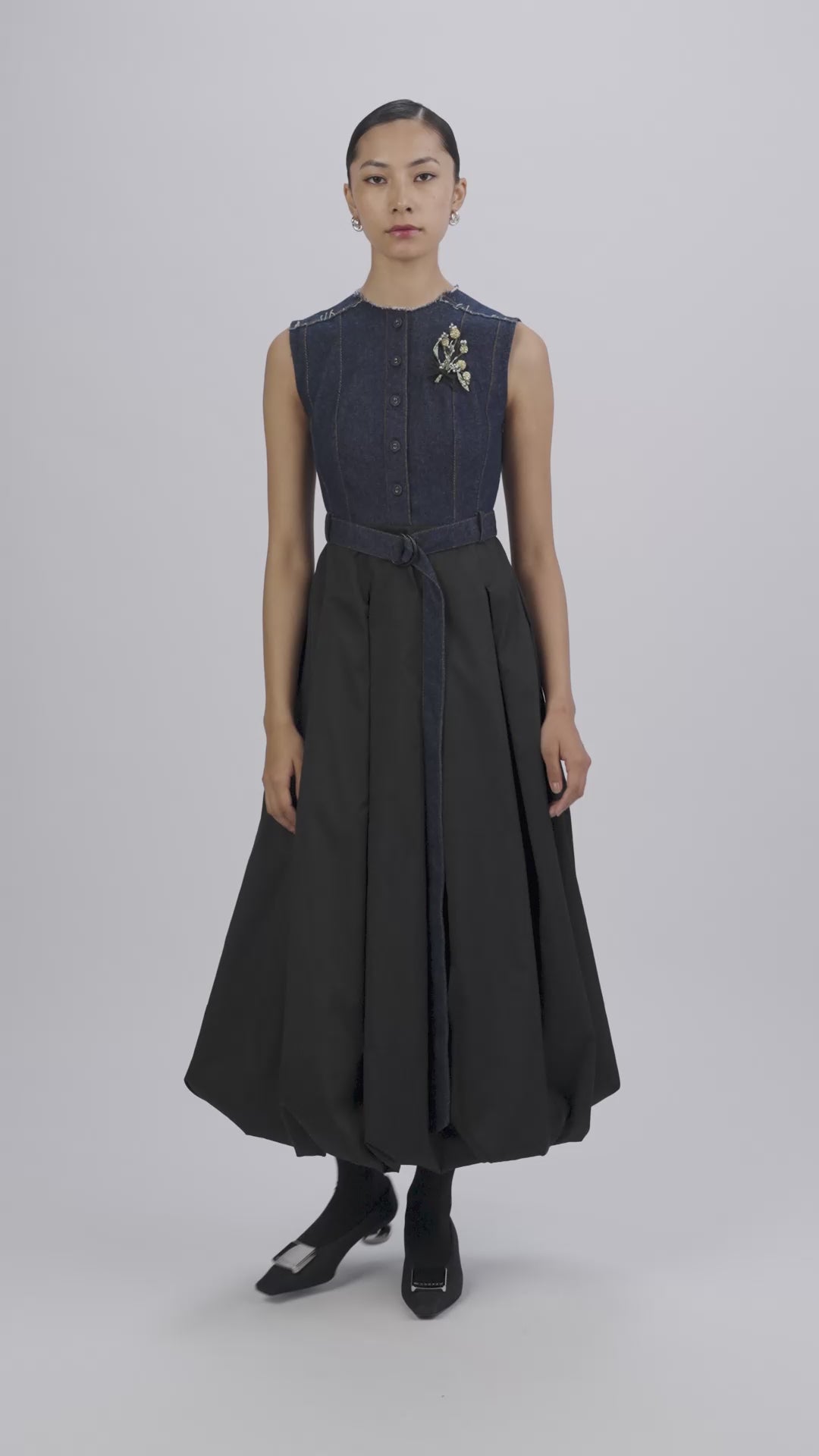 Sleeveless mid-length denim dress with a paneled bodice and raw-edged neckline, opening into a skirt of inverted box pleats.